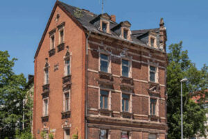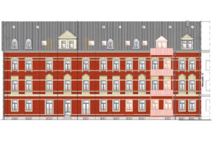 Auch die Fassaden des Wohngebäudes werden nach den Vorgaben des Denkmalschutzes saniert und in Teilen neu ergänzt – bspw. durch historisierende Profile auf den äußeren Fensterrahmen oder die Aufarbeitung der Original-Hauseingangstür.